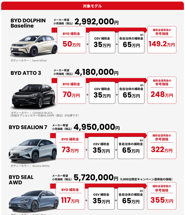 BYDは、日本でついに本格的な価格戦争に踏み切りました。すでに45か所の販売拠点を展開し、4車種の電動モデルを投入してきた同社は、9月いっぱいで前例のない大幅値下げを打ち出しました。対象となるのは、純電動セダン「SEAL(海豹)」、小型EV「DOLPHIN(海豚)」に加え、今年4月に発売されたSUV「SEALION 7(海狮07)」で、値下げ幅は50万~117万円に及びます。具体的には、SEAL四輪駆動版が117万円引き下げられ、改定後の価格は455万円、DOLPHIN標準版は50万円安の249.2万円となりました。さらに政府補助金を加味すれば、一部車種の実質値下げ幅は最大50%に達し、DOLPHINは最安149.2万円と、日本市場で最も安い純電動車となります。